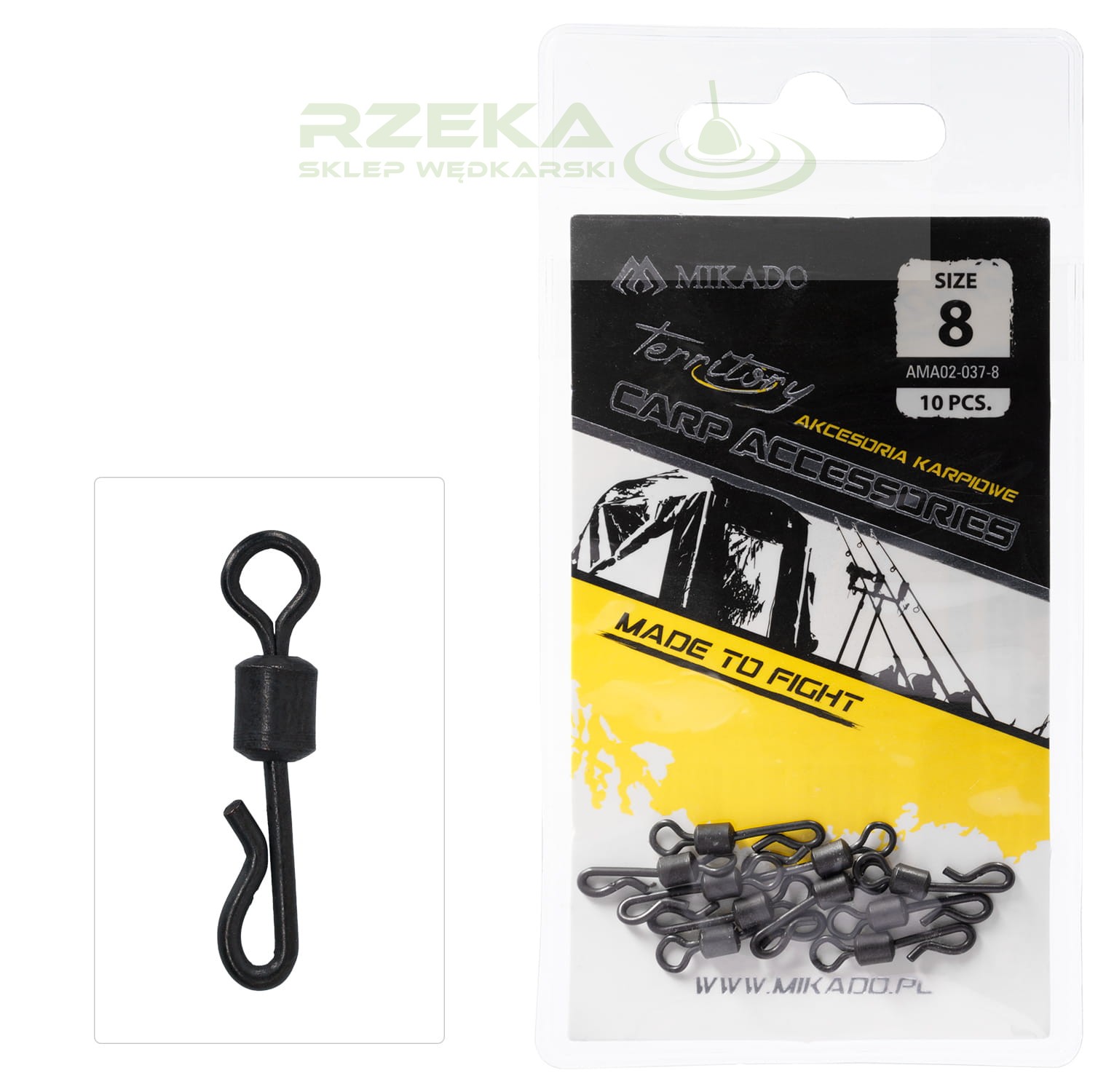 Popularny w wędkarskie karpiowym krętlik z szybkozłączką w standardowym rozmiarze 8, pasującym do bezpiecznych klipsów. Niezbędny przy produkcji wszelkich przyponów i zestawów końcowych podczas połowu karpi czy amurów. Wykończony czarnym, matowym kolorem.