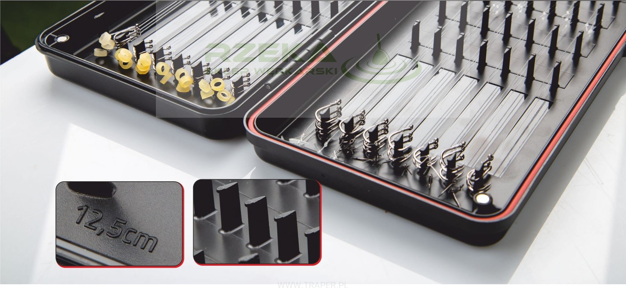 Najwyższej jakości profesjonalne pudełka na przypony wykonane zostały z tworzywa o wysokich parametrach wytrzymałości. Charakteryzują się bardzo precyzyjnym wykonaniem. Elementy takie jak zaczepy do haczyków i pętli z żyłki są idealnie gładkie i posiadają właściwy kształt. Szerokość i kształt zaczepu jest bardzo ważny szczególnie przy mniejszych rozmiarach haczyków. W pudełkach znajduje się po czternaście rzędów zaczepów. Piętnasty rząd wyższych słupków służy do odmierzania przyponów. Zaczepy znajdują się w odpowiednim oddaleniu od siebie. W krótszym pudełku możemy schować do 140 przyponów o długościach 7,5, 10, 12,5, 15, 17,5 lub 20 cm. Długie pudełko służy do przechowywania do 140 przyponów o długości 25, 30, 35 lub 40 cm. Zamknięcia pudełek są magnetyczne, w mniejszym są dwie pary a w dużym cztery pary magnesów. W rancie wewnętrznym dookoła pokrywy znajduje się uszczelka. Dzięki brakowi dostępu powietrza i światła żyłka zachowuje swoją "świeżość" i parametry przez długi czas. Solidne zawiasy z nierdzewnym zapewniają długą eksploatację.